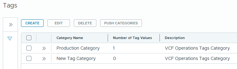 # Execute for Environment category and tags .\VCFOpsPolicyCreator.ps1 -VCFOpsFQDN "vcfops.local" -VCFOpsUsername "admin" -VCFOpsPassword "password" # GUI: Create Environment category with Production tag .\VCFOpsPolicyCreator.ps1 -VCFOpsFQDN "vcfops.local" -VCFOpsUsername "admin" -VCFOpsPassword "password" # GUI: Create Development tag in Environment category .\VCFOpsPolicyCreator.ps1 -VCFOpsFQDN "vcfops.local" -VCFOpsUsername "admin" -VCFOpsPassword "password" # GUI: Create Test tag in Environment category