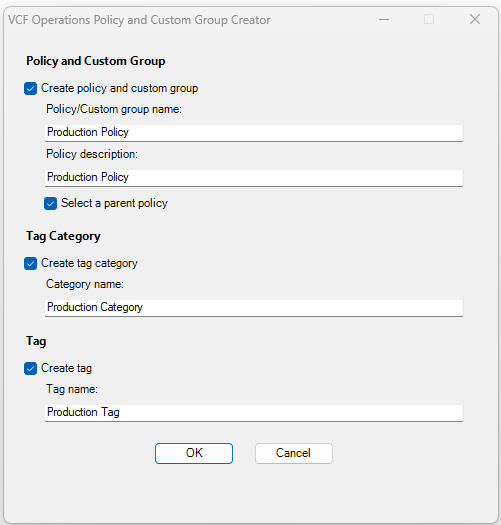 .\VCFOpsPolicyCreator.ps1 -VCFOpsFQDN "vcfops01.local.domain" -VCFOpsUsername "Admin" -VCFOpsPassword "VMware1!"