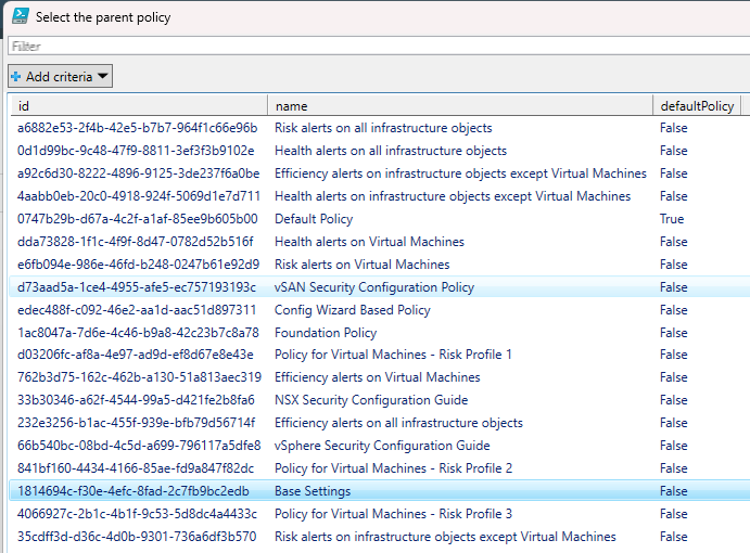 $ParentPolicySelection = $AllPolicies.policySummaries | Out-GridView -OutputMode Single -Title "Select the parent policy"